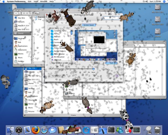 Watch as the screen you were just working on is turned into a 3D playground for real 3D puppy dogs! They run around leaving footprints all over your desktop, or any other image you like!